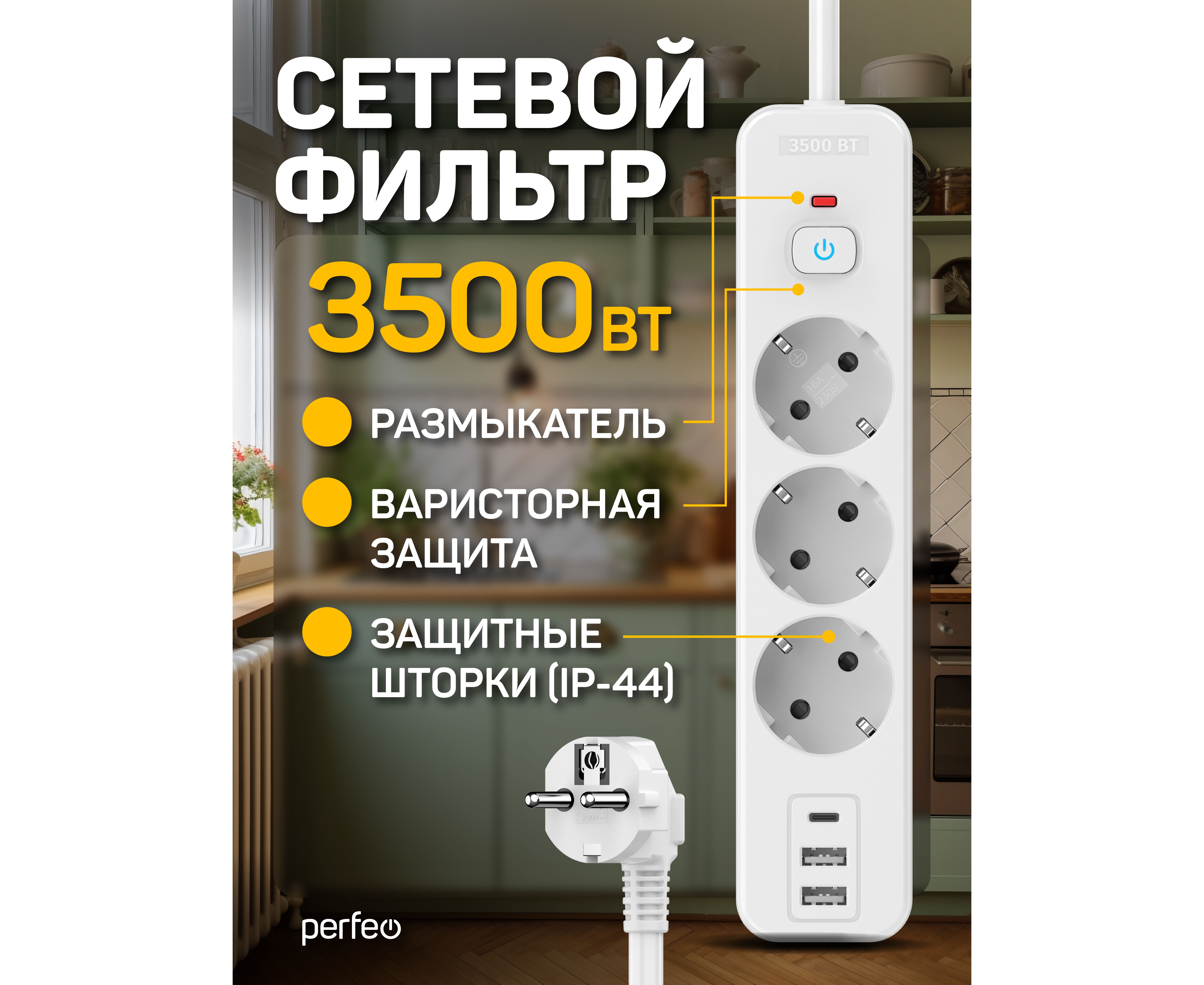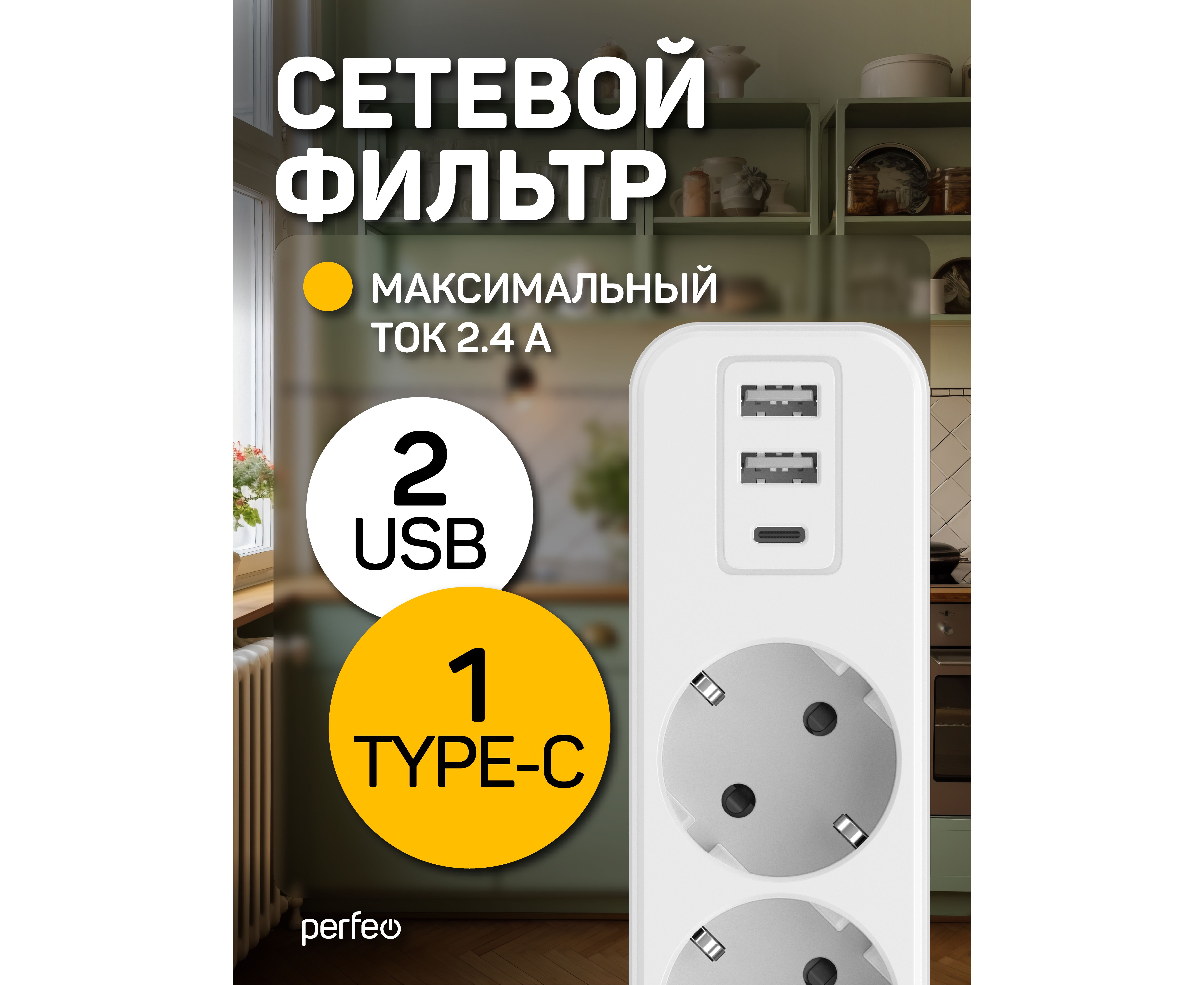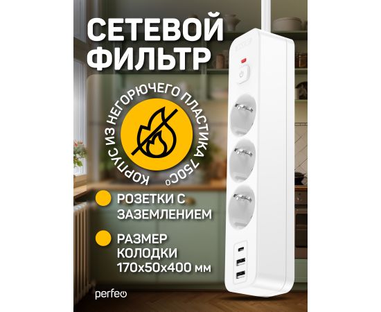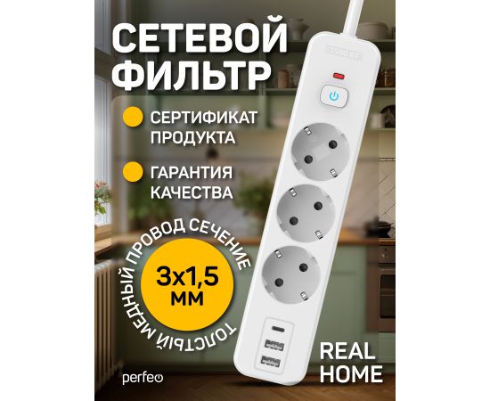 Сетевой фильтр Perfeo "REAL HOME" 2,0м, 3 розетки, 2USB+1TYPE-C, 16А, 3500 Вт,тройная защита,белый.