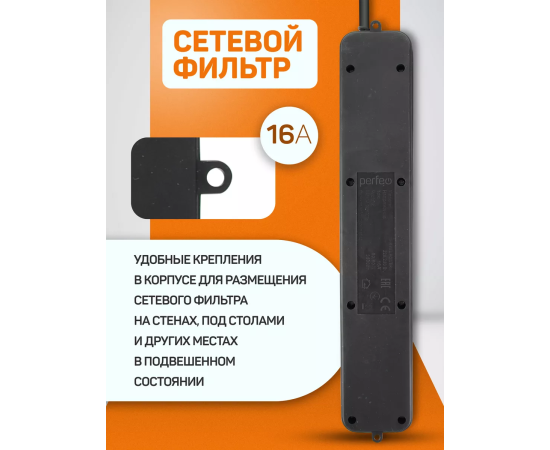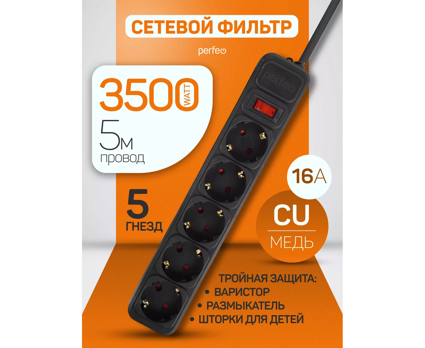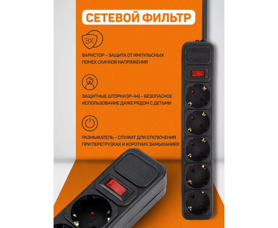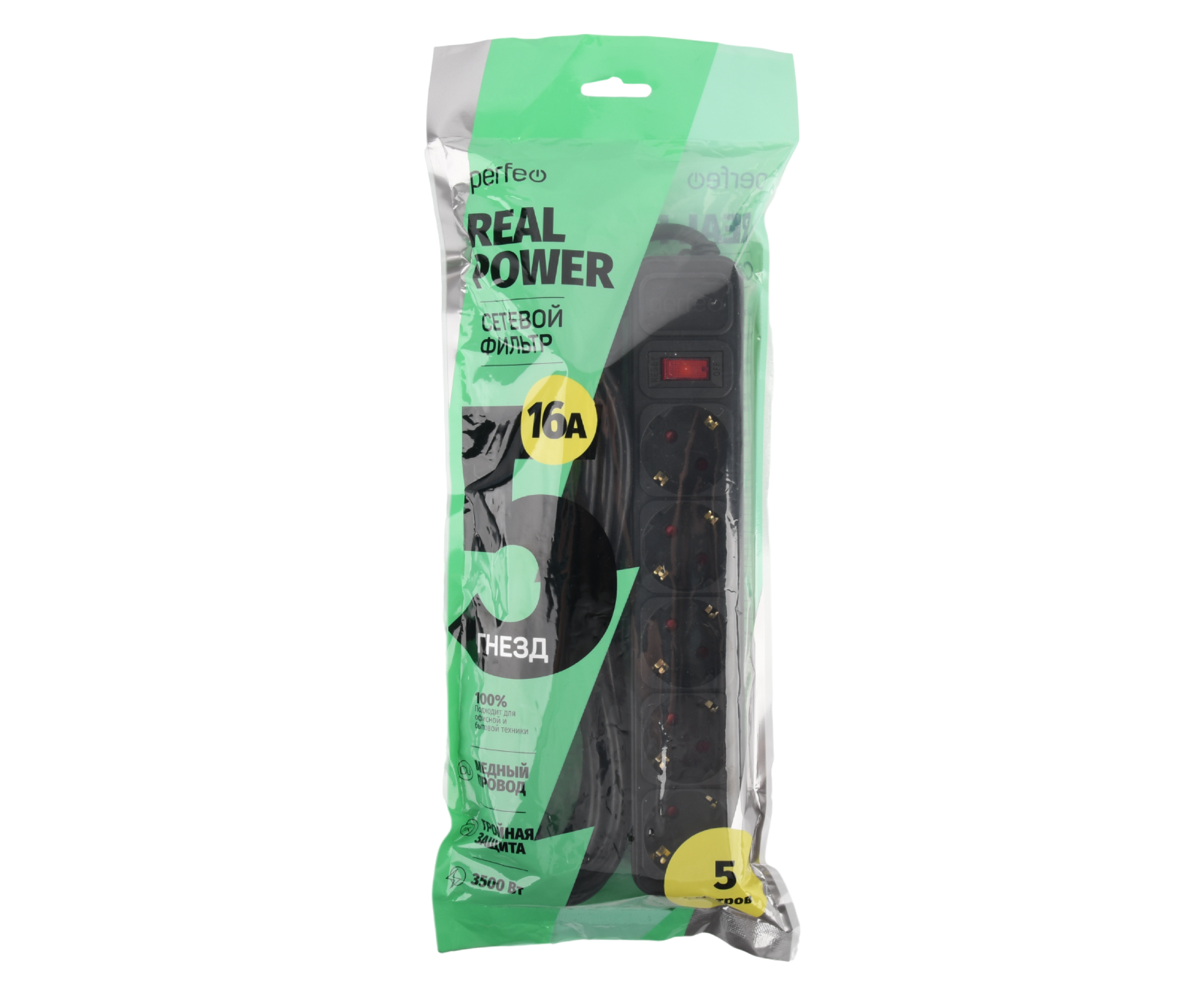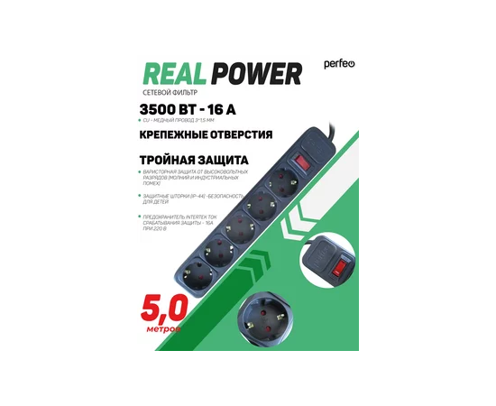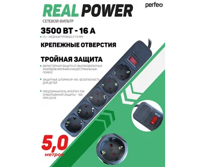 Сетевой фильтр Perfeo "REAL POWER", 5,0м, 5 розеток, 16А, 3500 Вт, тройная защита, черный