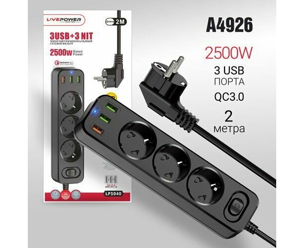 Сетевой фильтр-удлинитель Live-Power LP5040 3USB+QC3.0 + 3 розетки 2000mm Black