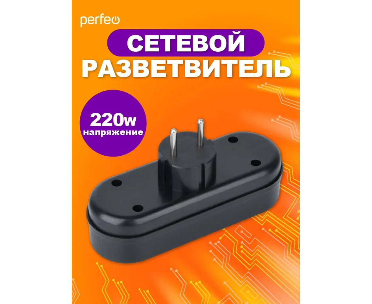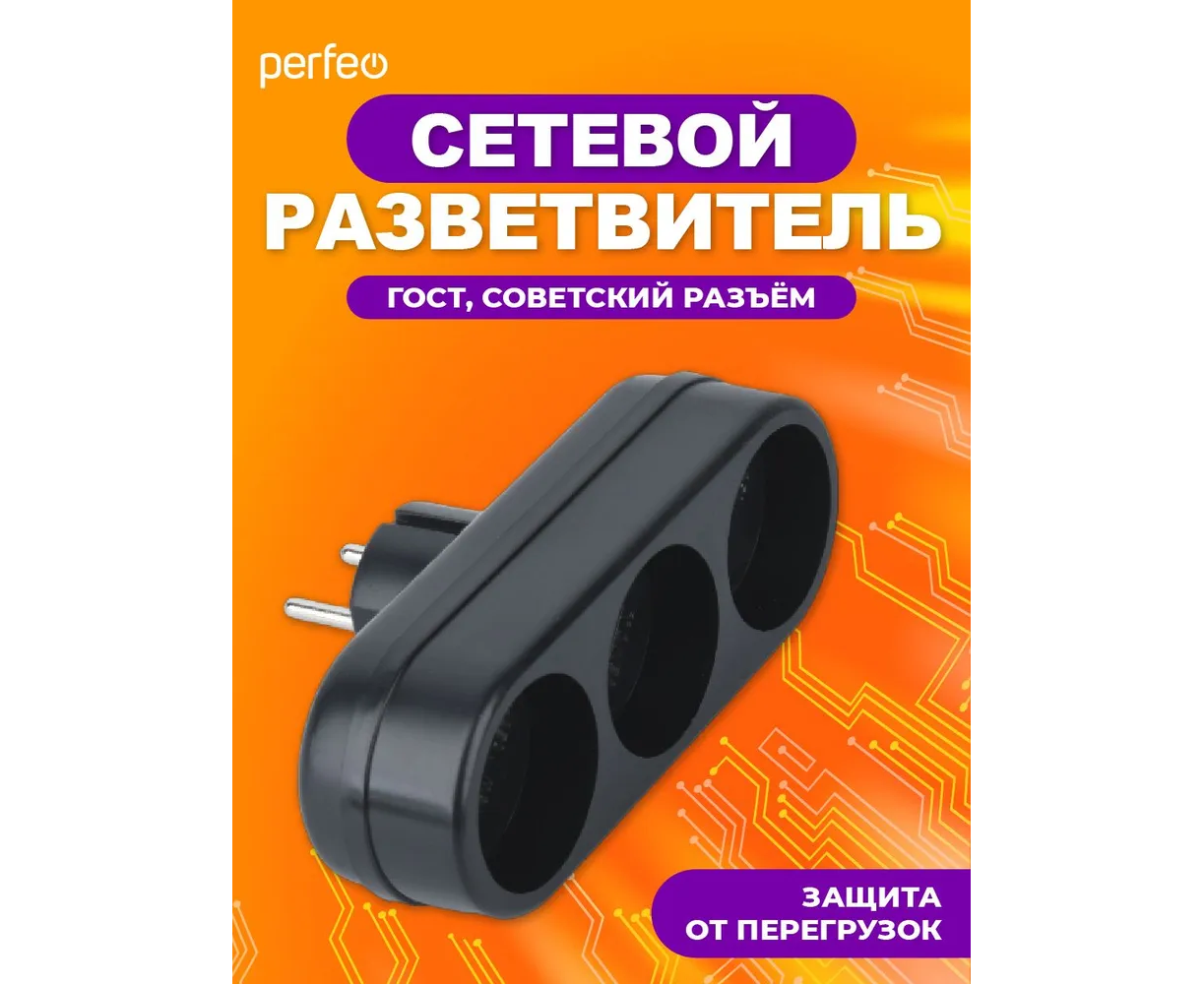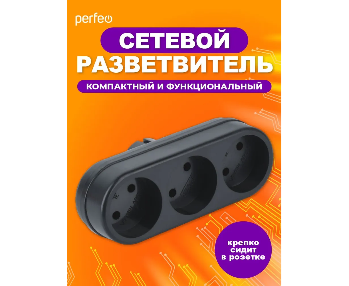 Сетевой разветвитель Perfeo "RU POWER'' 3 гнезда, 6А, без заземления, (3L), черный