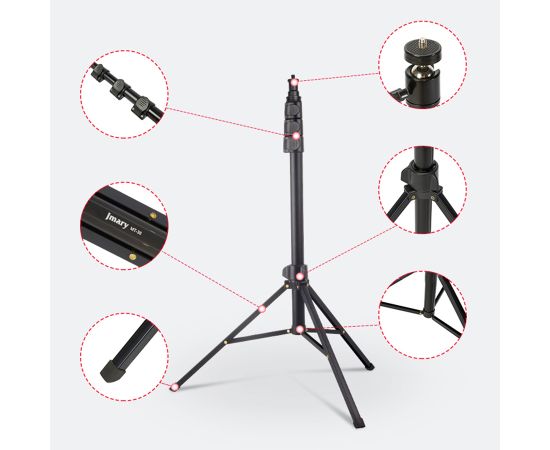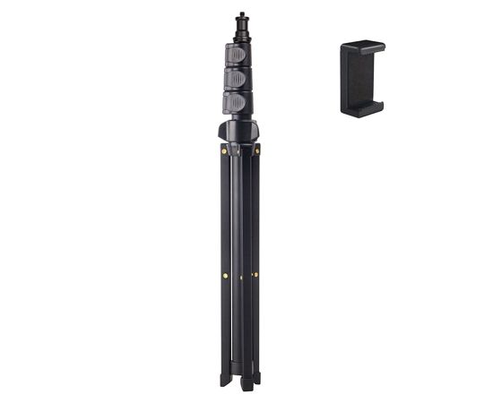 Устойчивый штатив Jmary MT-38 поможет вам снять идеальные фотографии и видеоролики. Это универсальна модель, которая подойдет для студийной фото, видеотехники и держателей с разъемом для крепления 1/4". На стойке можно зафиксировать фотоаппарат, смартфон или камеру, установить кольцевую светодиодную лампу или микрофон. Положение гаджета можно регулировать и выбирать удачный ракурс для съемки, чтобы вы в кадре выглядели идеально. С таким аксессуаром больше не придется переснимать кадр за кадром из-за дрожащих рук. В комплекте со штативом идет держатель для телефона с креплением для вспышки или микрофона. Преимущества напольного штатива для фото/видеокамер: Стойка сделана из надежного и износостойкого материала: металла. Ее вес составляет всего 430 граммов. На нее можно устанавливать гаджеты весом до 1 кг. Благодаря телескопической конструкции высоту штатива можно изменять от 51,5 см до 168 см. У Jmary MT-38 три ноги. Они раздвигаются и фиксируются в одном положении. На каждой ножке имеется прорезиненый наконечник, поэтому стойка устойчиво стоит на любой поверхности, а не скользит. Сверху штатива находится стандартный винт 1/4". На него можно закрепить раздвижной зажим для телефона из комплекта, фотоаппарат или видеокамеру, если в них предусмотрена резьба.