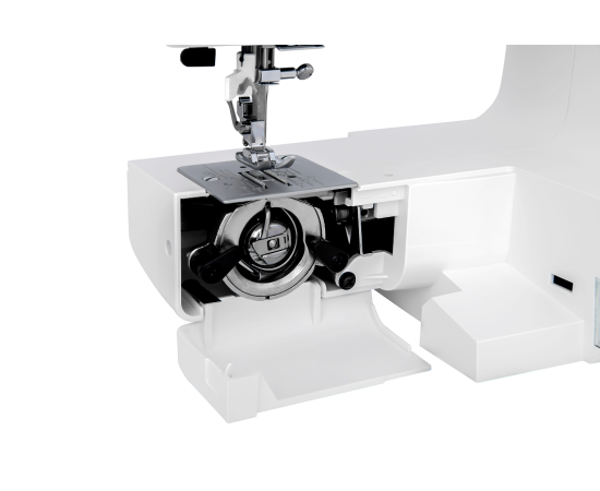 двойная игла, коленный рычаг подъема лапки, нитевдеватель, ручной обрезатель нити, отключение механизма подачи ткани (отключение зубчатой рейки)
