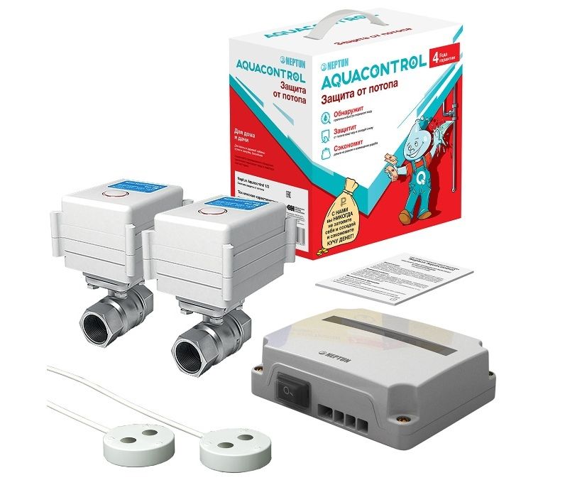 Система контроля протечки воды Neptun Aquacontrol 1/2 в автоматическом режиме отслеживает появление протечки и мгновенно перекрывает воду при возникновении аварийной ситуации в системе водоснабжения. Данная система надежно защитит от потопа имущество пользователя и соседей снизу, а также позволит существенно сэкономить деньги на новом ремонте и возмещении причиненного ущерба.