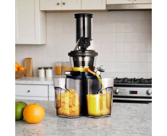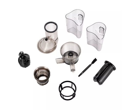 Соковыжималка имеет полностью разборную конструкцию, что облегчает её уборку и хранение. Весь процесс приготовления сока происходит быстро благодаря продуманной форме шнека и отжимного блока, распределяющего в разные стороны сок и жмых.