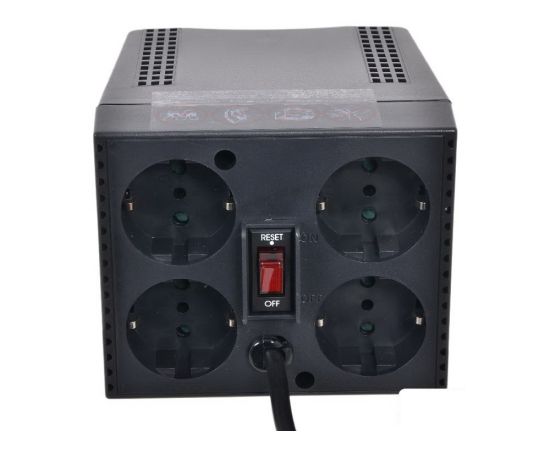 Особенности эффективность до 95%, потребляемая мощность менее 10 Вт, варистор для защиты от всплексов напряжения, стабилизация выходного напряжения +/- 5%, индикатор включения, индикатор пониженного напряжения, индикатор повышенного напряжения, все розетки оборудованны заземлением