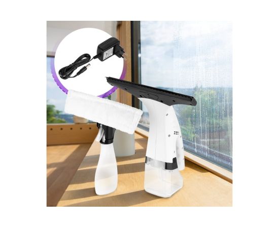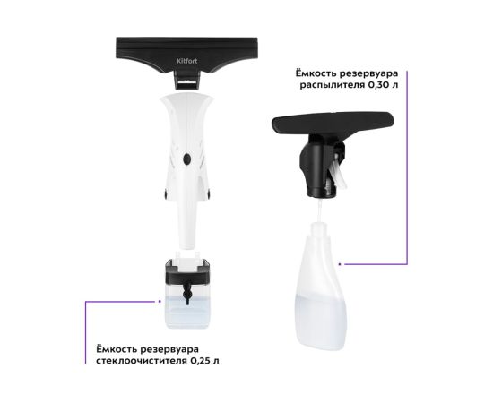 Стеклоочиститель КТ-5163 — это набор «3 в 1» для мойки стекол, зеркал, кафельных и других твердых гладких поверхностей. В комплект входит распылитель, моющая насадка с тряпкой из микрофибры и сам стеклоочиститель — небольшой аккумуляторный пылесос для всасывания жидкостей с плоских поверхностей.