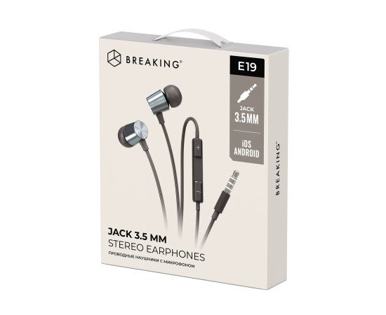 Проводная гарнитура BREAKING E19 вакуумные - универсальные наушники с микрофоном 3.5 мм. Это проводные наушники , которые обеспечивают отличное качество звучания и максимальную степень комфорта. Чувствительный микрофон и простое управление обеспечивают удобство при разговоре. Наушники для телефона с аудио разъёмом 3.5 мм jack . Дизайн стильный и минималистичный. На кабеле находится микрофоном и кнопка регулировки звуков.