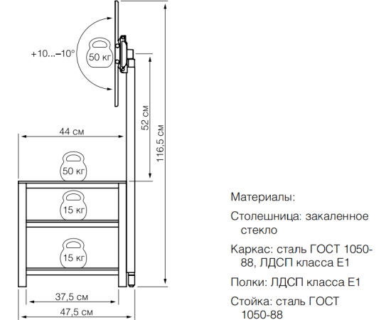 угол наклона 10°, угол поворота 17°, встроенный кабель-канал, максимальная нагрузка на полку 15 кг