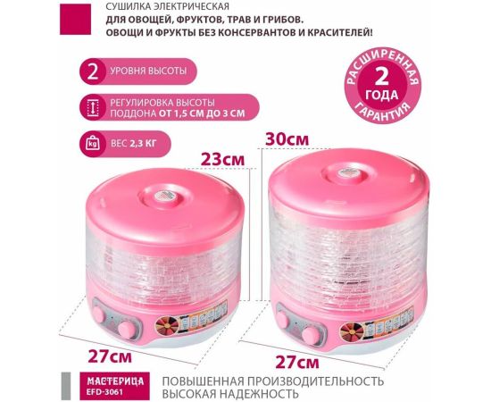 Яркая и современная сушилка для овощей Мастерица EFD-3061 розового цвета с перламутром станет не только помощницей на кухне и даче, но и украсит интерьер. За счет компактных размеров дегидратор не займет много места в квартире, а бесшумная работа прибора не доставит неудобств.