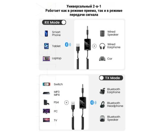 Режим приемника (RX): подключает проводные наушники/акустику к Bluetooth-устройствам