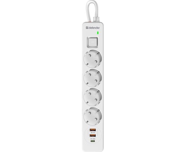 Сетевой фильтр DEFENDER с сетевым фильтром DFS 143 3 м, белый, 4розетки, USB+TypeC (99434)