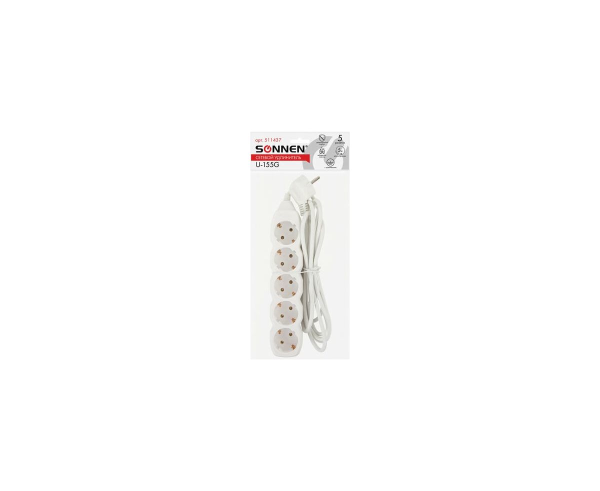 Удлинитель сетевой SONNEN U-155G (511437) 5 розеток, c заземлением, 10А, 5м, белый