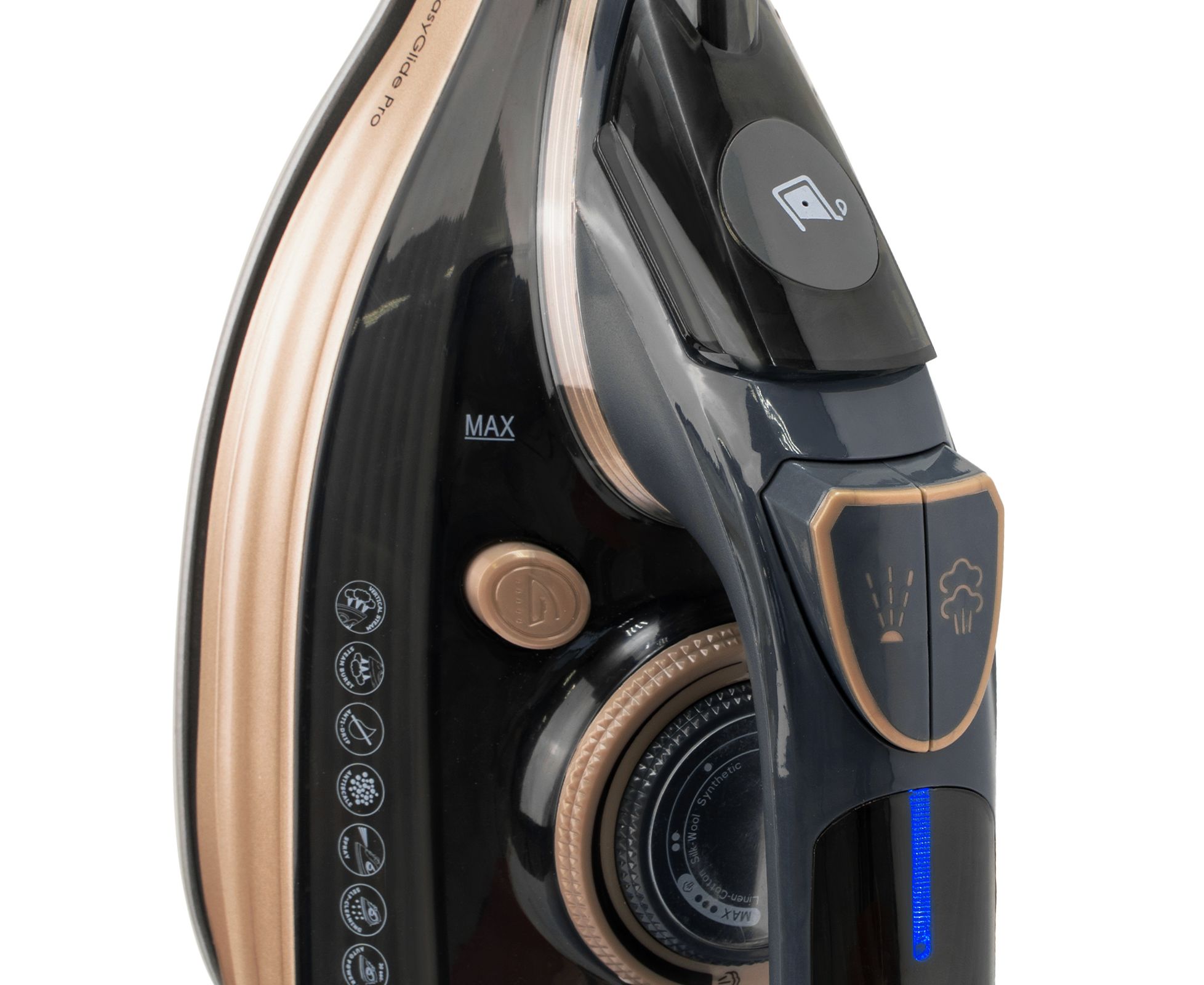 Керамическое покрытие EasyGlide Pro обеспечивает легкое скольжение по ткани, защищая материалы от повреждений. Резервуар объемом 300 мл подходит для комфортной глажки без частого долива воды. Подача пара до 80 г/мин эффективно разглаживает складки, а мощный паровой удар до 240 г/мин справляется даже с самыми сложными тканями.