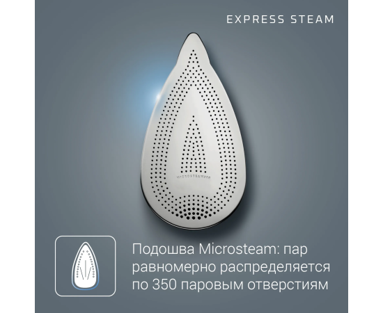 Уникальная запатентованная подошва Microsteam 350 с более чем 350 микроотверстиями обеспечивает равномерное распределение пара для максимальной эффективности глажения.
