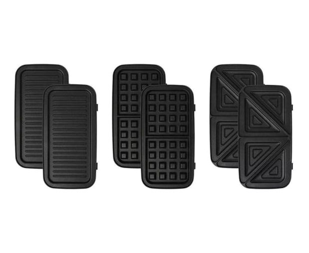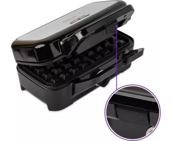 Набор из 3 пар сменных панелей позволяет готовить разнообразные блюда. Благодаря возможности снимать панели, их легко мыть после готовки. Зажим на ручке удерживает крышку вафельницы в закрытом состоянии. Это удобно в готовке, при транспортировке и хранении.