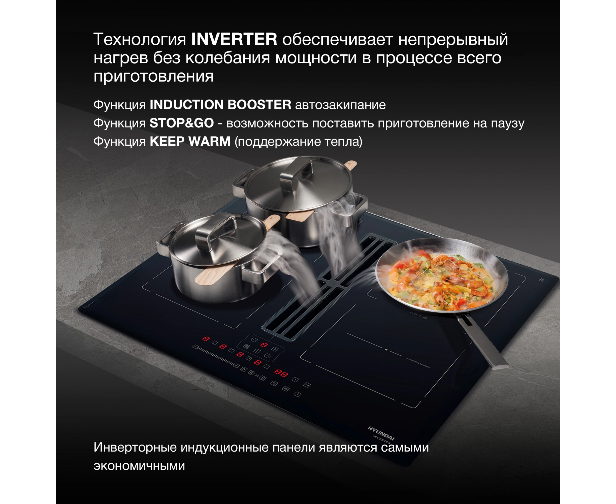 автоматика закипания, кратковременная пауза, наличие вытяжки, распознавание наличия посуды, таймер