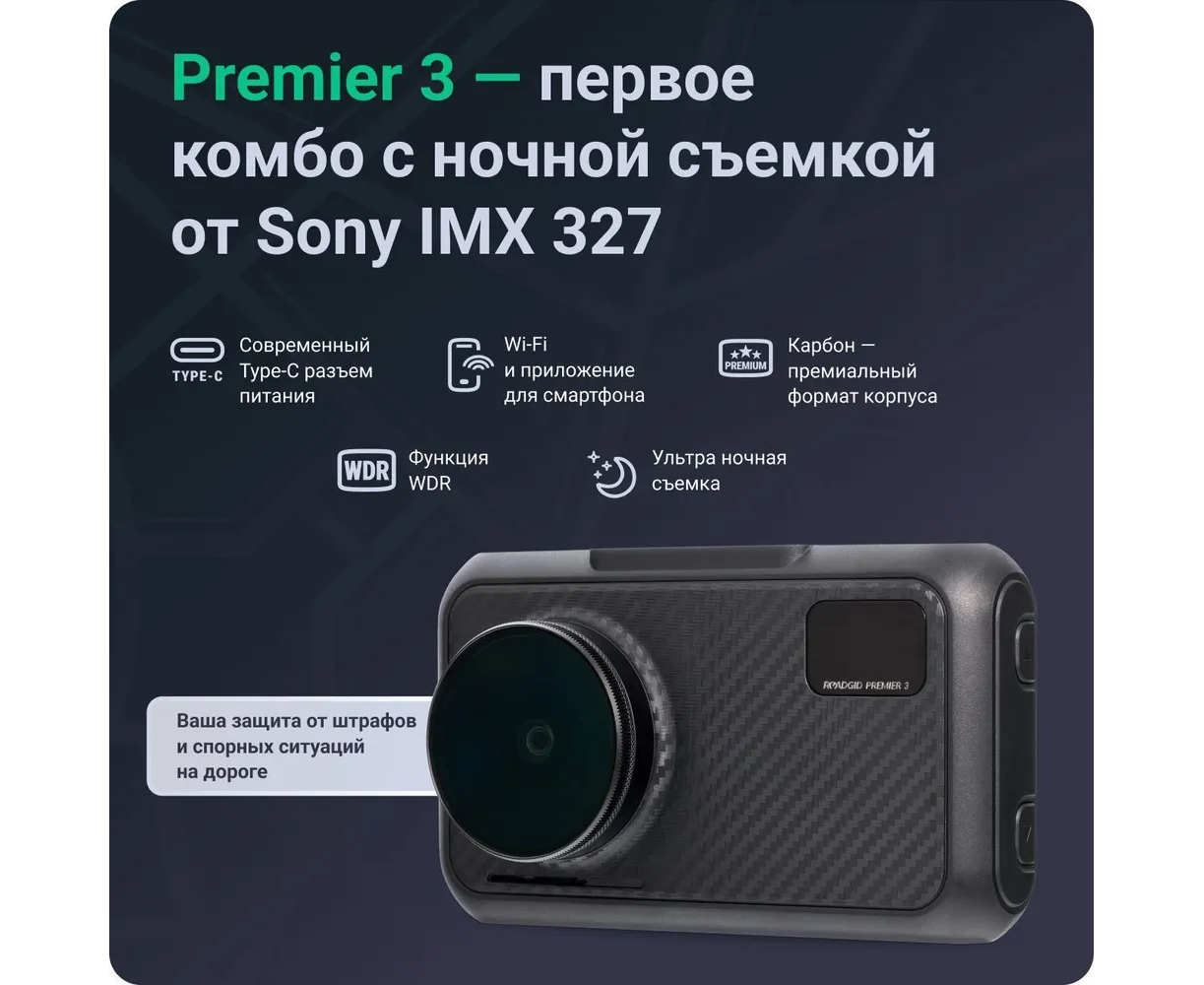 Видеорегистратор Roadgid Premier 3 Carbon 1045107 с сигнатурным радар-детектором Wi-Fi и GPS