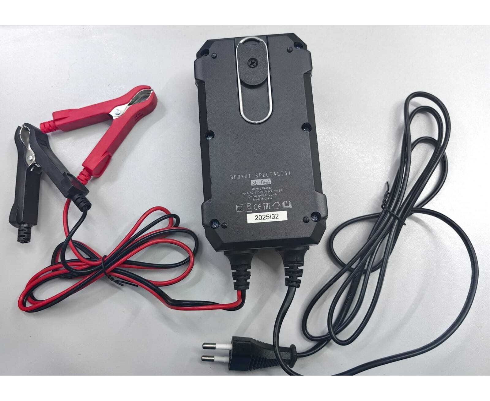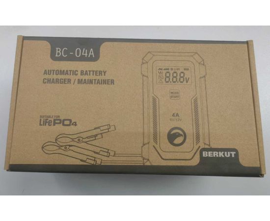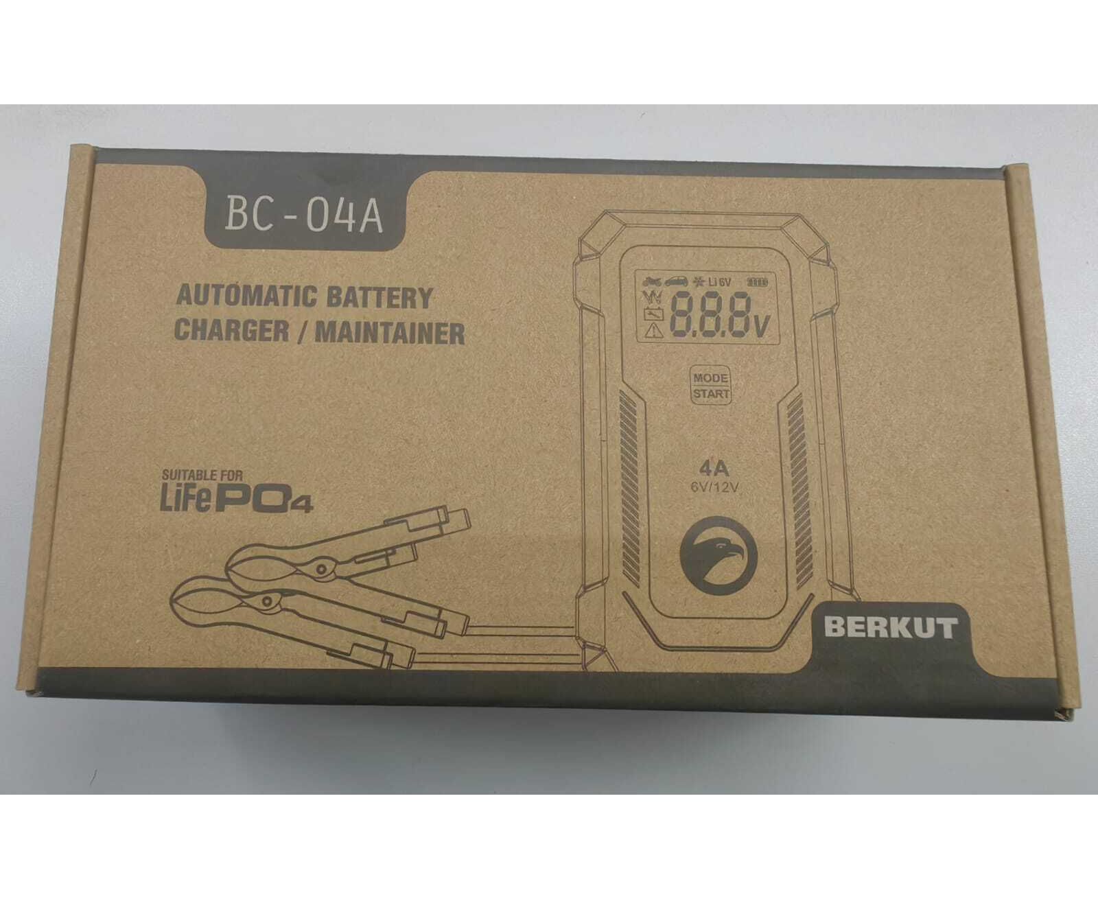 Зарядное устройство BERKUT BC-04A — полностью автоматическое устройство, предназначенное для обслуживания и зарядки 6 и 12-Вольтовых аккумуляторных батарей емкостью от 4 до 90 Ач, используемых в мото- и садовой техники и т.п. Устройство является полностью автоматическим и имеет поэтапный поэтапным алгоритмом зарядки в 9 стадий.