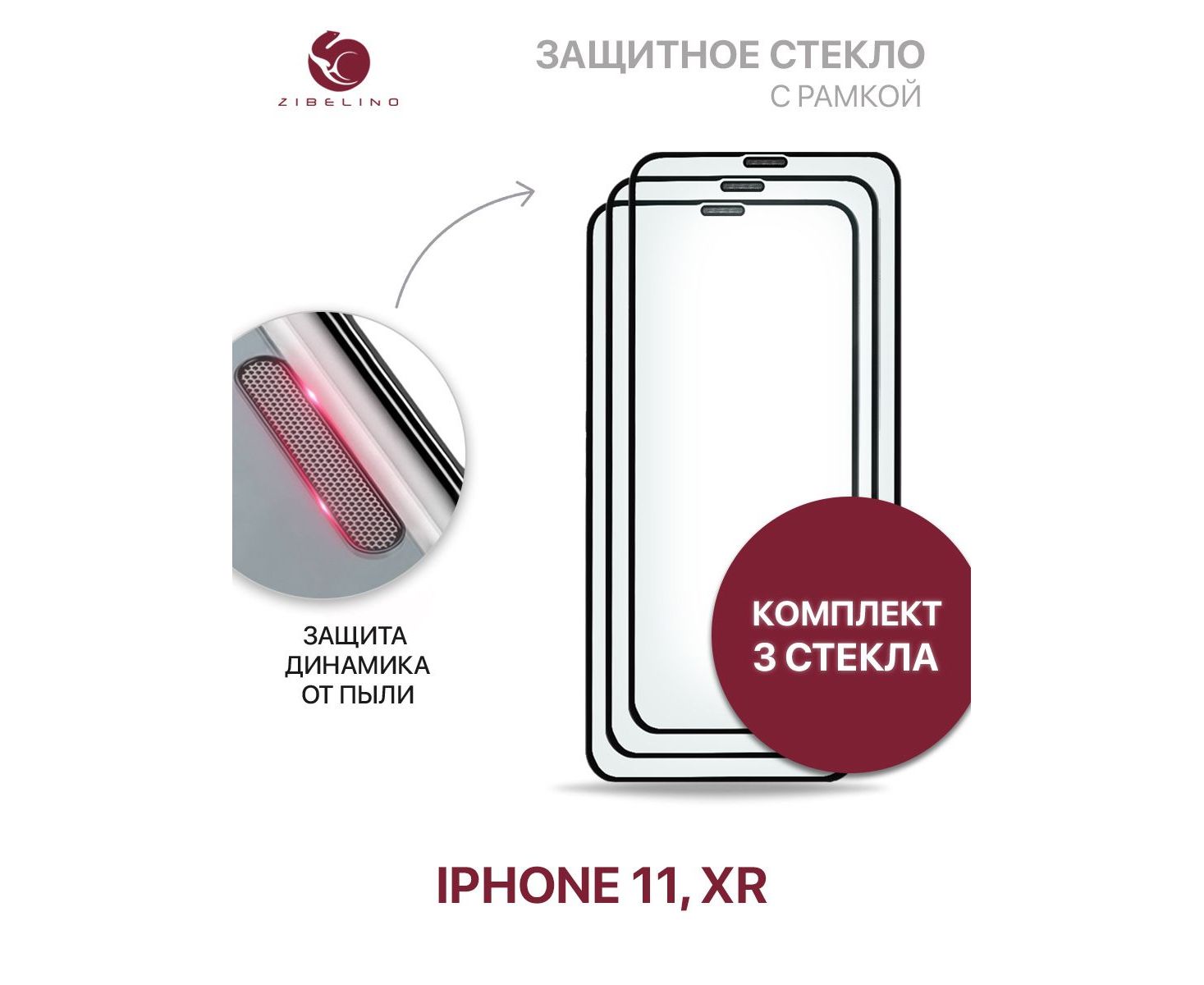 Защитное стекло Premium (Комплект 3 шт) для Apple iPhone 11, Xr с рамкой, с защитой динамика от пыли (Айфон 11 Хr)